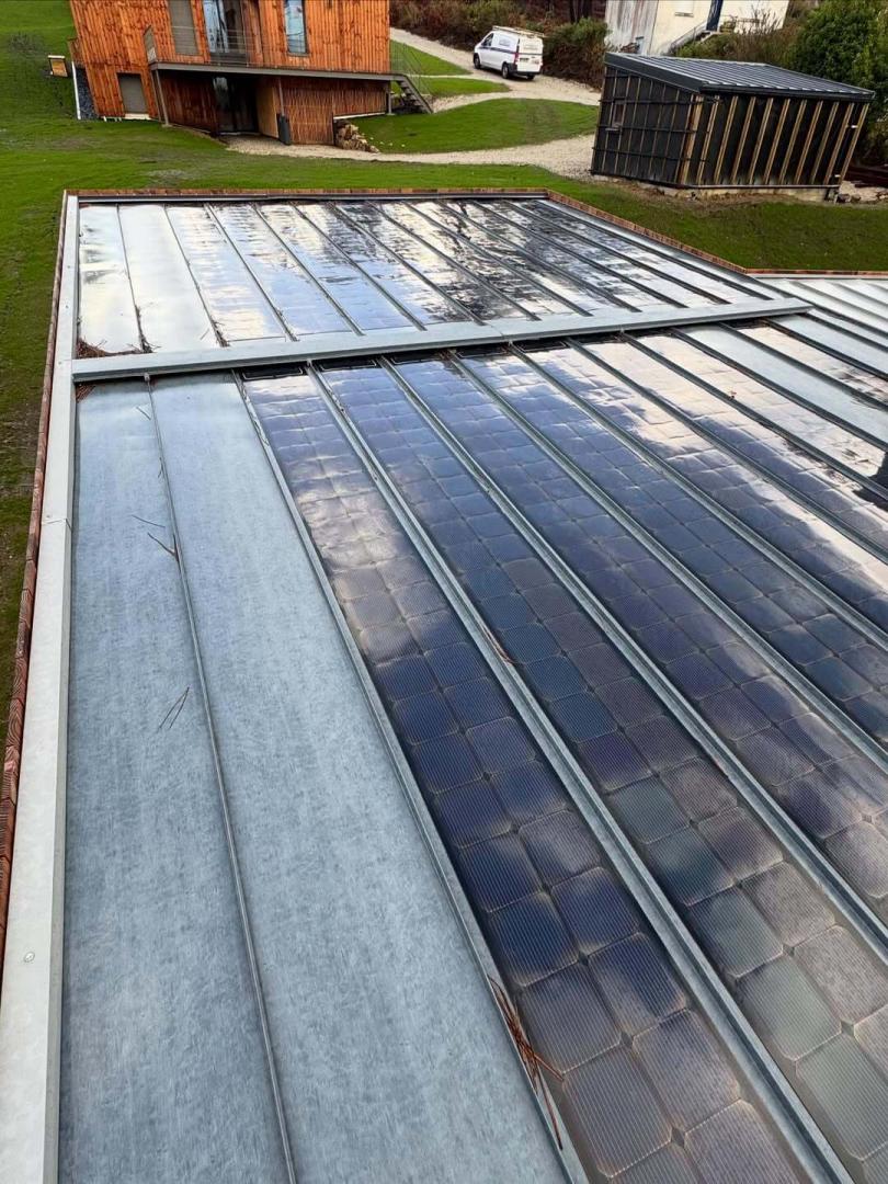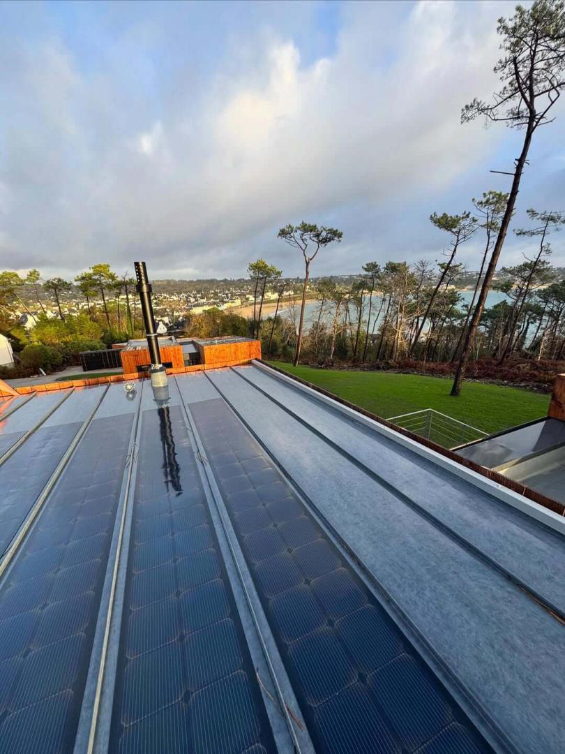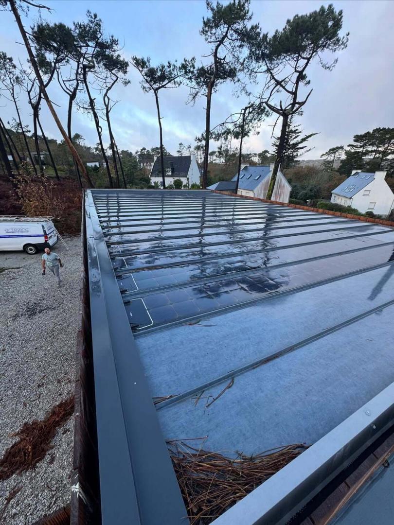 Réfection de la toiture du restaurant Le Grand Large à Mousterlin. Après la dépose de l’ensemble de couverture en ardoises, mise en œuvre d’une couverture en ardoises naturelles ainsi qu’un bardage en aluminium pour assurer l’étanchéité et l’esthétique de l’ouvrage.